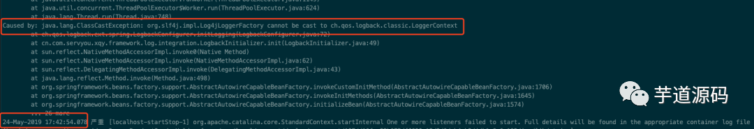 org.springframework.beans.factory.BeanCreationException: Error creating bean with name 'cn.com.xxx.framework.log.integration.LogbackInitializer#0' defined in class path resource [spring/spring-log-init.xml]: Invocation of init method failed; nested exception is java.lang.ClassCastException: org.slf4j.impl.Log4jLoggerFactory cannot be cast to ch.qos.logback.classic.LoggerContext