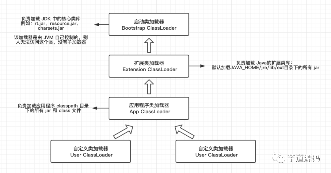 我们写的 Java 应用代码,一般是通过 App ClassLoader 应用加载器进行加载,它不会自己先去加载它,而是通过 Extension ClassLoader 扩展类加载器进行加载(其中扩展类加载器又会去找 Bootstrap ClassLoader 启动类加载器进行加载),只有父加载器无法加载情况下,才会让下级加载器进行加载。