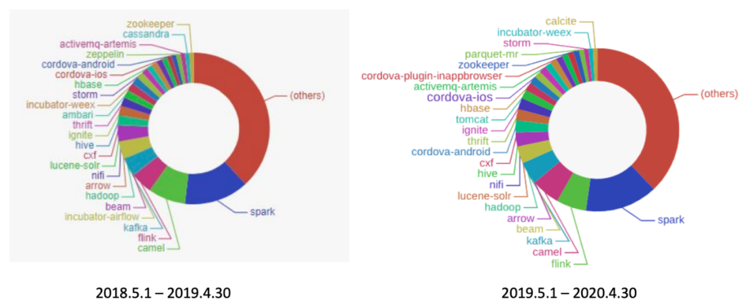 特别值得一提的是,在前20名邮件列表中,Flink 社区是唯一提供中文用户交流频道的(user-zh@flink.apache.org),而且其活跃度在2020年中仅次于 Flink 的英文用户邮件列表。自2018年开始,Flink 在邮件列表的活跃度已连续三年蝉联第一,我们很欣喜地看到越来越多的中文母语使用者在开源社区中发声,为全球开源软件社区带来不可忽视的影响力。