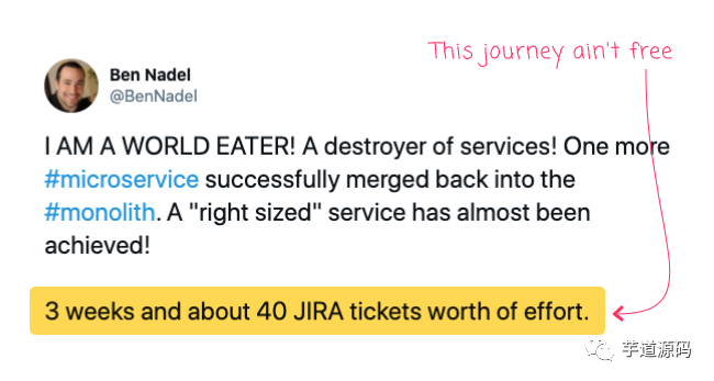 每当这样做的时候,我都冒着引入新 bug 和破坏用户体验的风险。将微服务合并成单体架构的过程中,虽然有时候很令人兴奋,但总体还是令人感到恐惧的,而且需要大师级的规划、风险控制和测试。再次强调一遍,如果它不值得做的话,我就不会做了。