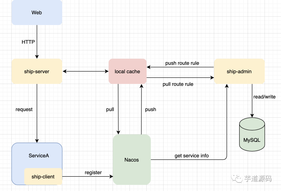 注意: 这张图与实际实现有点出入,Nacos push到本地缓存的那个环节没有实现,目前只有ship-sever定时轮询pull的过程。ship-admin从Nacos获取注册服务信息的过程,也改成了ServiceA启动时主动发生HTTP请求通知ship-admin。