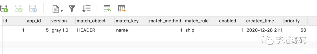 ship: http: app-name: order version: prod_1.0 context-path: /order port: 8082 admin-url: 127.0.0.1:9001 server: port: 8082 nacos: discovery: server-addr: 127.0.0.1:8848在数据库添加路由规则配置,该规则表示当http header 中的name=ship时请求路由到gray_1.0版本的节点。