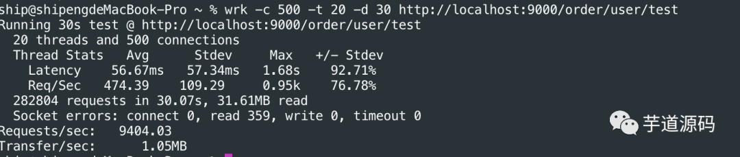 压测结果:20个线程,500个连接数,吞吐量大概每秒9400个请求。