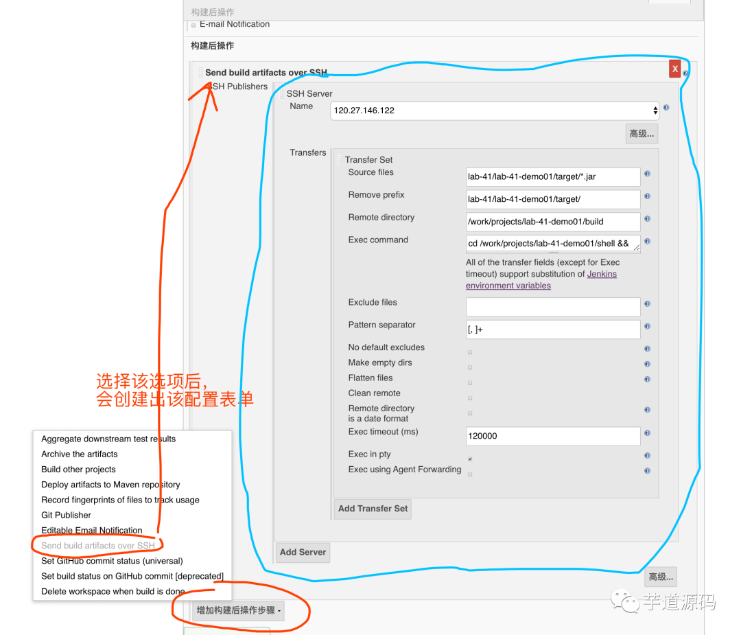 点击「增加构建后操作步骤」按钮,选择「Send build artifacts over SSH」选项,配置将 Maven 构建出来的 jar 包,通过 SSH 发送到远程服务器,并执行相应脚本,进行启动 Java 服务。如下图所示: