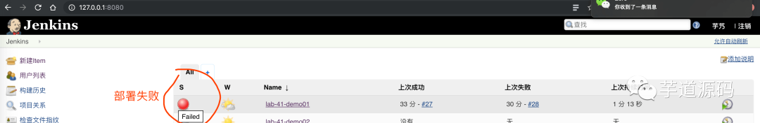 此时,我们回到 Jenkins 首页,可以看到该部署任务执行结果是失败的。如下图所示: