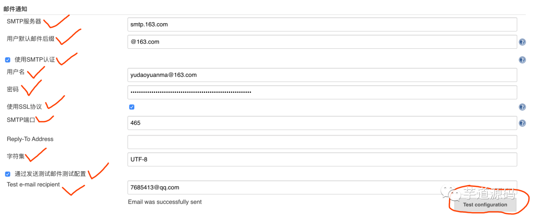 ③ 配置完成后,点击「邮件通知」位置的「Test configuration」按钮,测试发送邮箱的功能。如果测试通过,在界面上我们会看到 "Email was successfully sent" 提示。同时,我们打开收件邮件,会看到测试邮件,如下图所示: