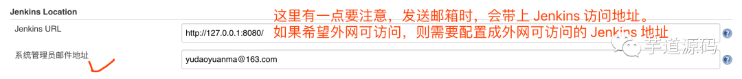 ② 不过要注意,一些邮箱服务,要求使用 SMTP 认证的用户名和发件邮箱保持一致,例如说网易 163 邮箱。因此,我们上拉到「Jenkins Location」位置,配置发件邮箱。如下图所示: