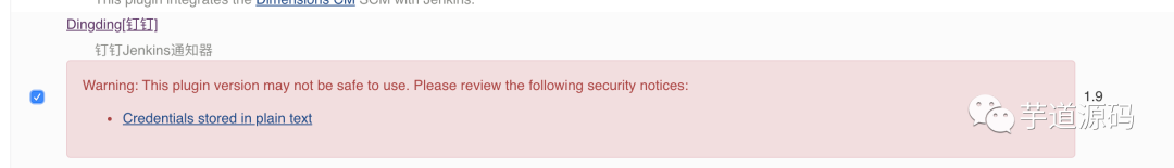 默认情况下,提供钉钉通知的 Jenkins 插件 Dingding Notification Plugin 并未安全,所以我们需要进行安装。安装的步骤很简单,和2.2.4 安全其它插件小节是一样的,胖友自己去安装下噢。如下图所示: