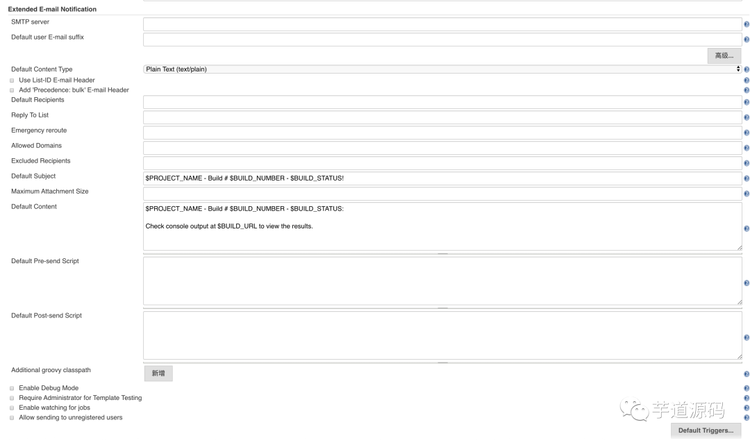 $DEFAULT_RECIPIENTS、$DEFAULT_REPLYTO等变量,是由 Extended E-mail Notification 插件提供,胖友可以按照「Manage Jenkins -> Configure System」的顺序,进入「配置」界面,然后下拉到「Extended E-mail Notification」位置,进行配置。如下图所示: