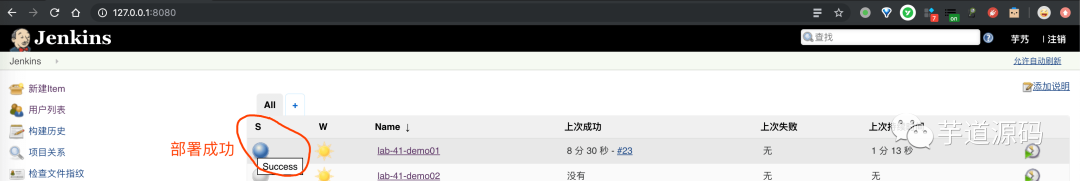 此时,我们回到 Jenkins 首页,可以看到该部署任务执行结果是成功的。如下图所示:
