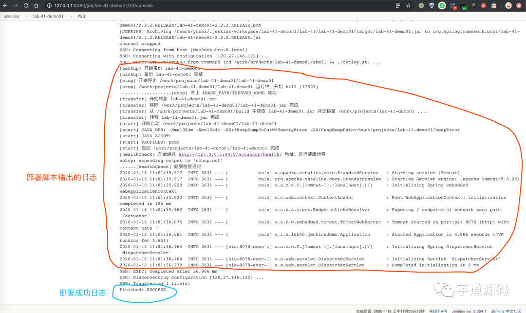 lab-41-demo01.jar:项目的jar包。build目录:Jenkins 构建完项目后的新jar包,会上传到build目录下,避免对原jar包覆盖,导致无法正常关闭 Java 服务。backup目录:对历史jar包的备份目录。每次使用新的jar启动服务时,会将老的jar移到backup目录下备份。shell目录:脚本目录。目前只有deploy.sh脚本,我们来一起瞅瞅。