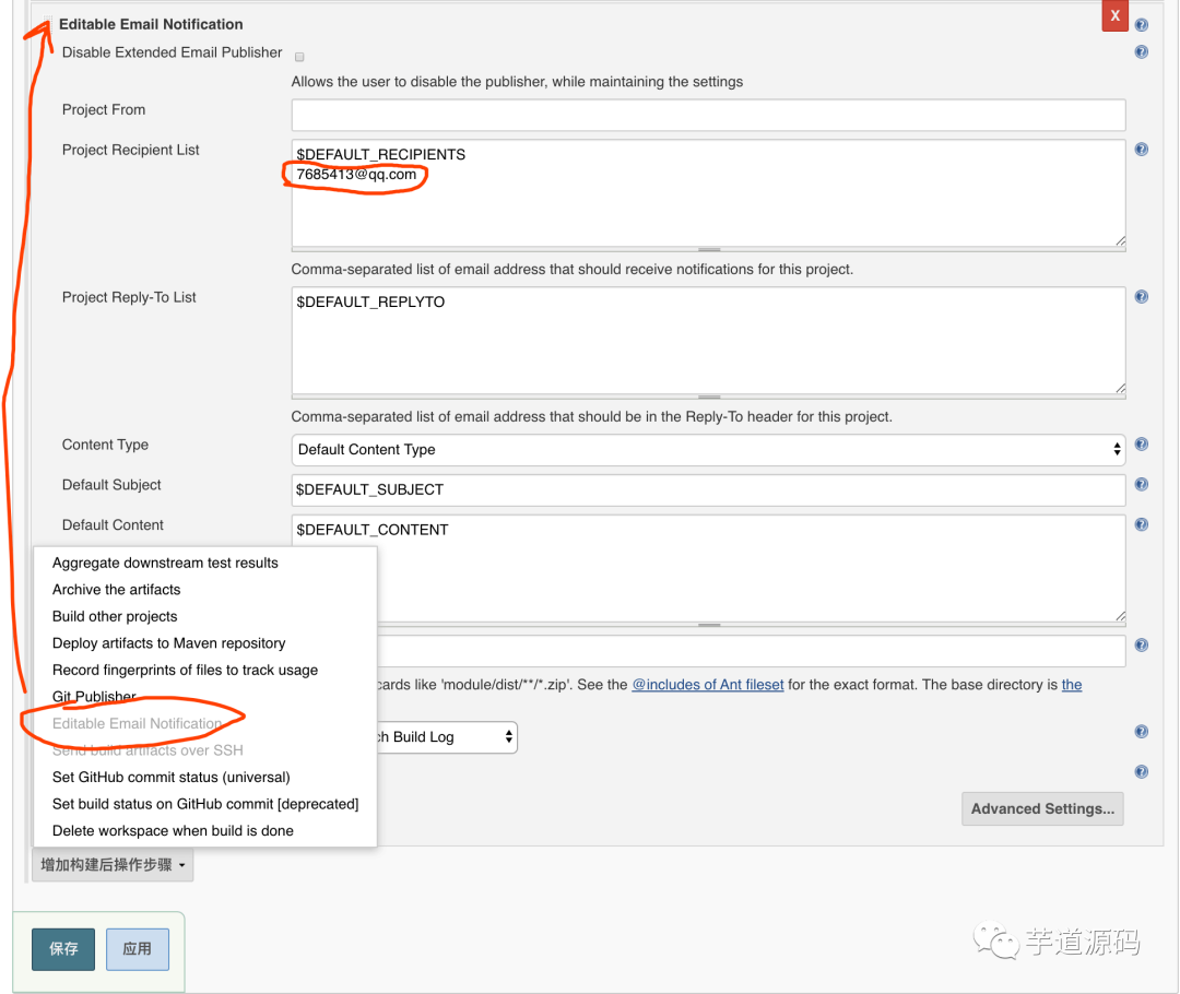 这里主要配置构建失败、构建不稳定情况下的邮箱通知配置。一般情况下,按照图中配置即可。