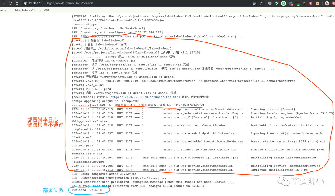修改完成后,重新进行部署任务的构建,最终会构建失败。控制台输出日志如下图所示: