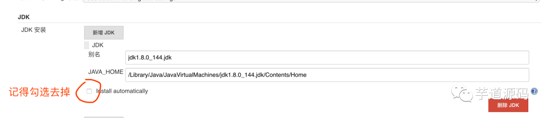 点击「新增 JDK」按钮,并取消「Install automatically」选项。之后,输入本地的 JAVA_HOME。如下图所示: