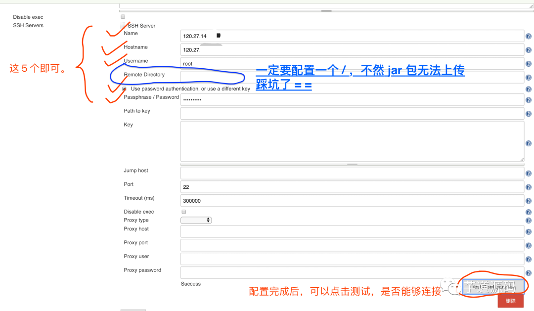 因为我们通过 SSH 复制构建出来的 jar 包到远程服务器上,所以我们需要进行 SSH 配置。这里,我们使用账号密码的认证方式,实现 SSH 连接到远程服务器。
