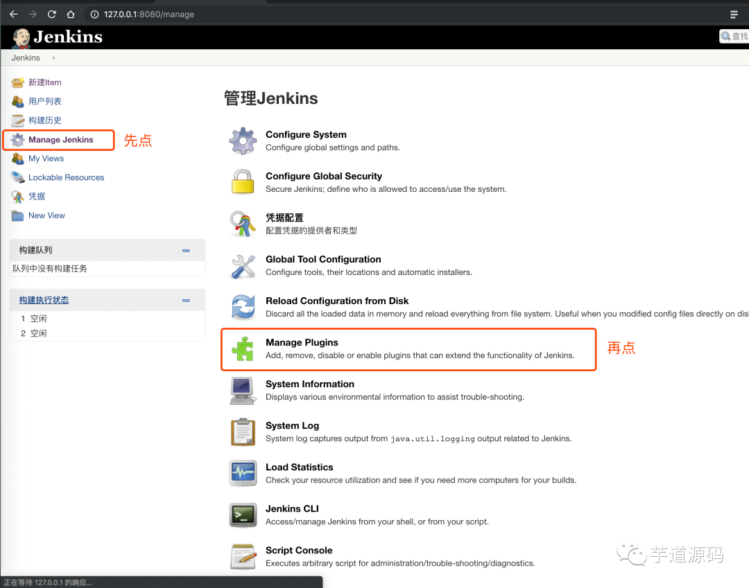 从 Jenkins 首页开始,按照「Manage Jenkins -> Manage Plugins」的顺序,进入「插件管理」界面。如下图所示: