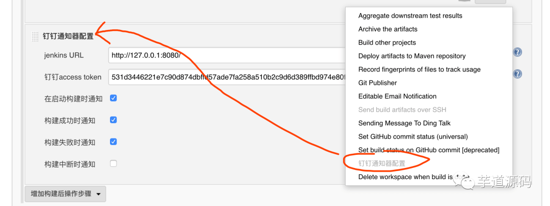 在「2.4 Jenkins 部署任务配置」的基础上,我们修改钉钉配置。仅仅修改一处配置项即可,哇哈哈。