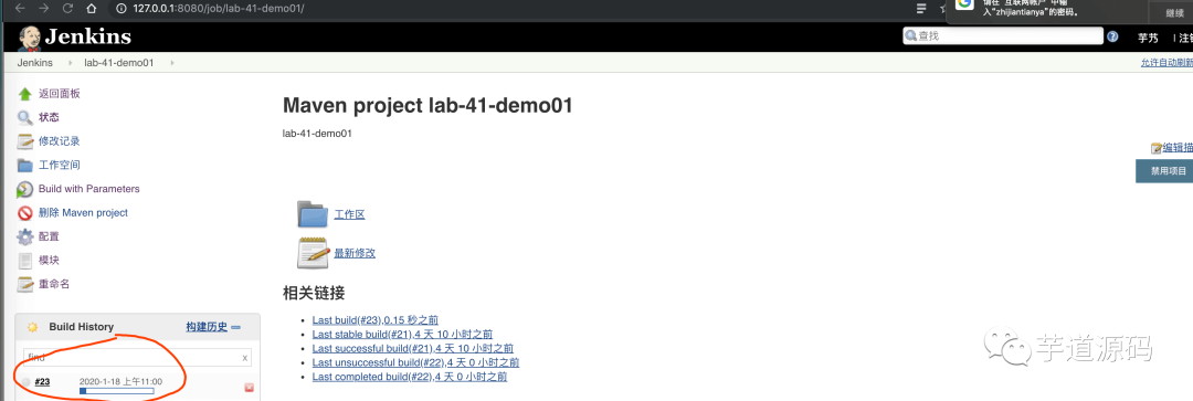 点击 Build History 中的红圈部分,查看本次构建。之后,点击「 控制台输出」菜单,查看整个构建过程,会看到很多日志。如下图所示: