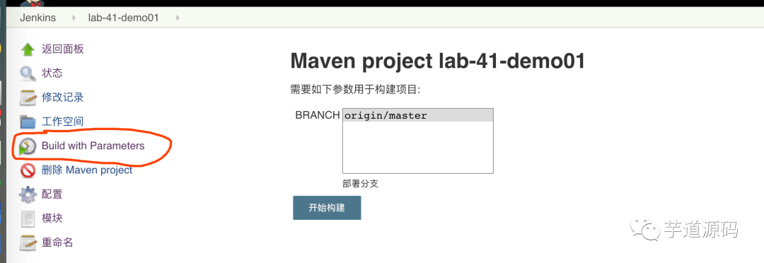 因为我们的 https://github.com/YunaiV/SpringBoot-Labs 仓库只有一个 master 分支,所以我们在 BRANCH 参数仅有一个选择。点击「开始构建」按钮,开始部署。如下图所示: