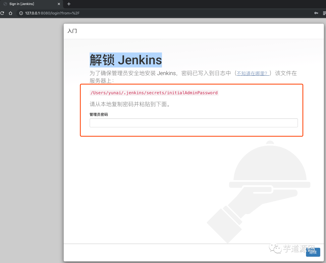 默认情况下,Jenkins 启动在 8080 端口。所以,我们可以使用浏览器,访问 http://127.0.0.1:8080/ 地址,进入 Jenkins 首页。因为此时我们未完成 Jenkins 的入门,所以被重定向「入门」页面。如下图所示: