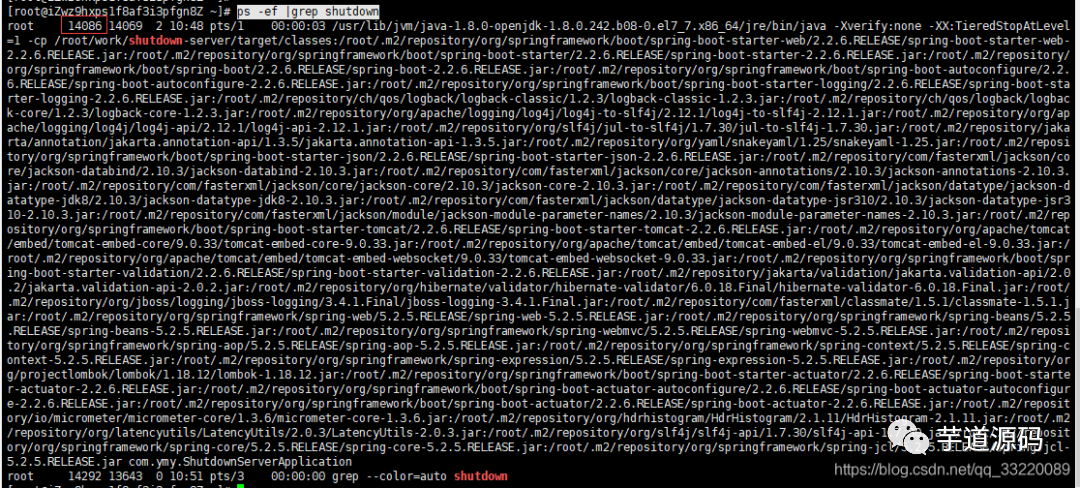 这个就是项目的进程号,接下来我们先测试test接口,让线程进入休眠状态,然后再使用kill -15 14086停止项目