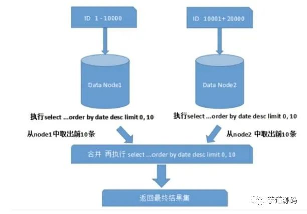 跨节点多库进行查询时,会出现limit分页、order by 排序等问题。分页需要按照指定字段进行排序,当排序字段就是分页字段时,通过分片规则就比较容易定位到指定的分片;当排序字段非分片字段时,就变得比较复杂.需要先在不同的分片节点中将数据进行排序并返回,然后将不同分片返回的结果集进行汇总和再次排序,最终返回给用户 如下图: