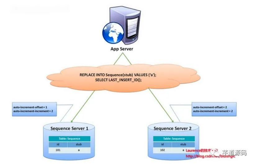 此方案较为简单,但缺点较为明显:存在单点问题,强依赖DB,当DB异常时,整个系统不可用。配置主从可以增加可用性。另外性能瓶颈限制在单台Mysql的读写性能。 另有一种主键生成策略,类似sequence表方案,更好的解决了单点和性能瓶颈问题。这一方案的整体思想是:建立2个以上的全局ID生成的服务器,每个服务器上只部署一个数据库,每个库有一张sequence表用于记录当前全局ID。 表中增长的步长是库的数量,起始值依次错开,这样就能将ID的生成散列到各个数据库上