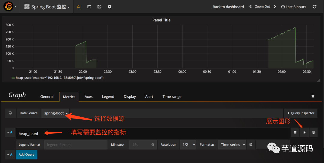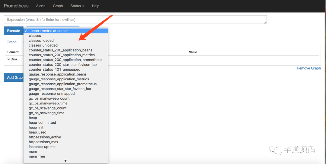 提示,此处不能任意填写,只能填已有的指标点,具体的可以在 Prometheus 的首页看到,即 http://localhost:9090/graph