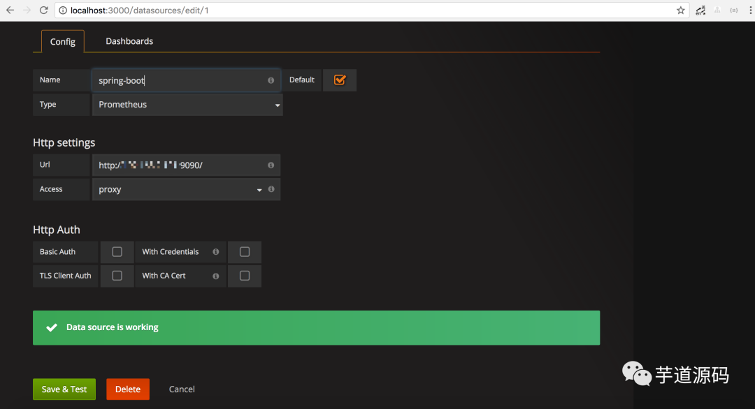 接着,访问 http://localhost:3000/ 配置 Prometheus 数据源: