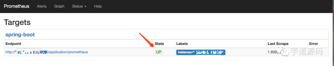 最后,访问 http://localhost:9090/targets , 检查 Spring Boot 采集状态是否正常。