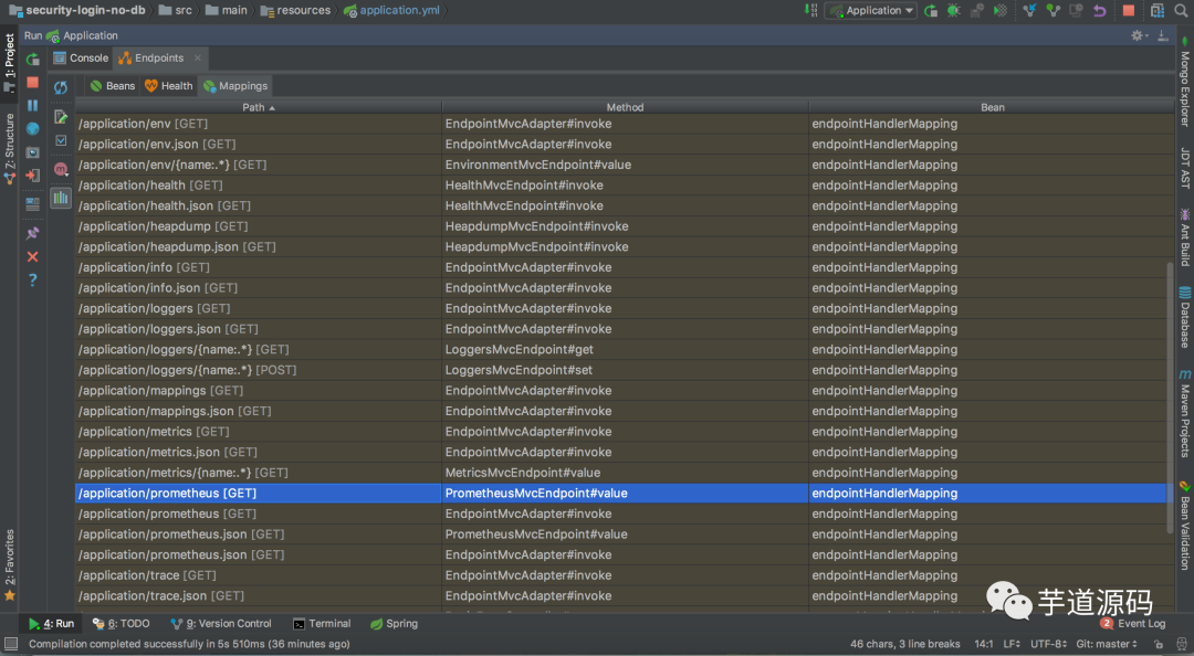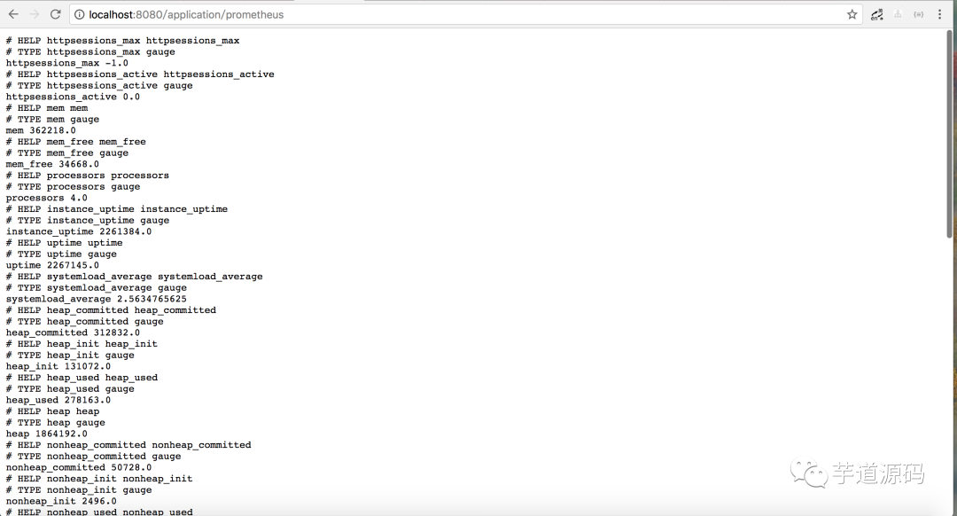 利用账号密码访问 http://localhost:8080/application/prometheus ,可以看到 Prometheus 格式的指标数据