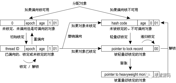 可以看到锁信息也是存在于对象的mark word中的。当对象状态为偏向锁(biasable)时,mark word存储的是偏向的线程ID;当状态为轻量级锁(lightweight locked)时,mark word存储的是指向线程栈中Lock Record的指针;当状态为重量级锁(inflated)时,为指向堆中的monitor对象的指针。