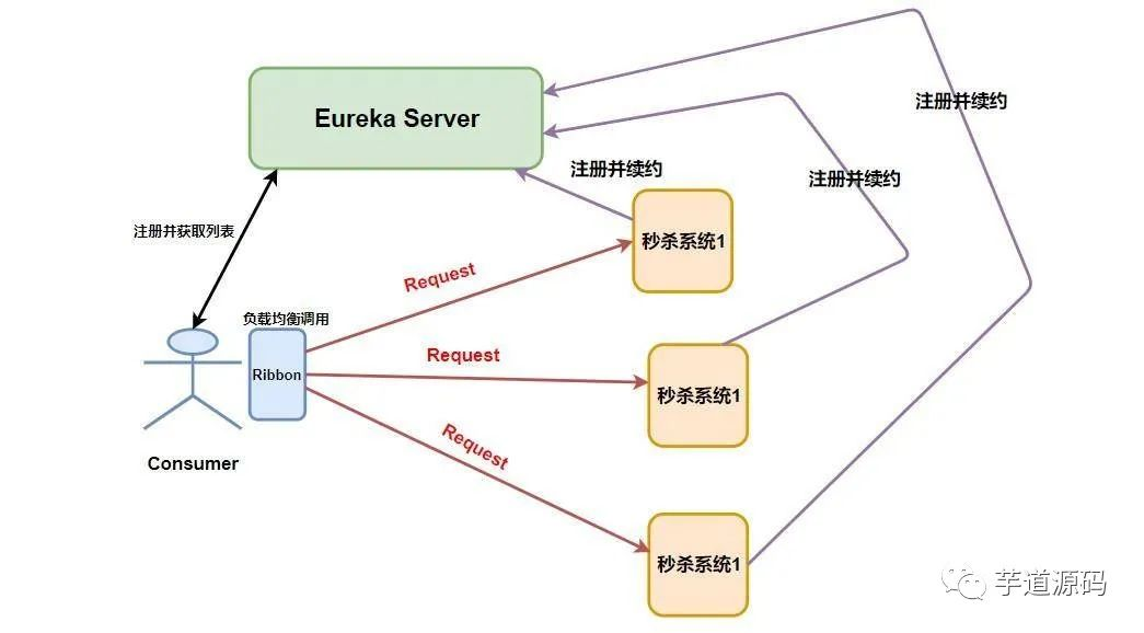 我们再举个????,比如我们设计了一个秒杀系统,但是为了整个系统的 高可用 ,我们需要将这个系统做一个集群,而这个时候我们消费者就可以拥有多个秒杀系统的调用途径了,如下图。