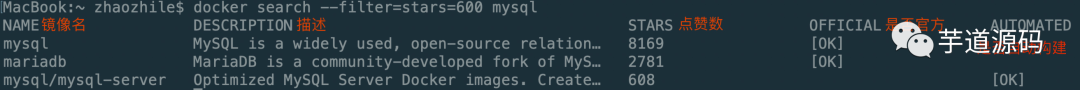 docker search --filter=stars=600 mysql