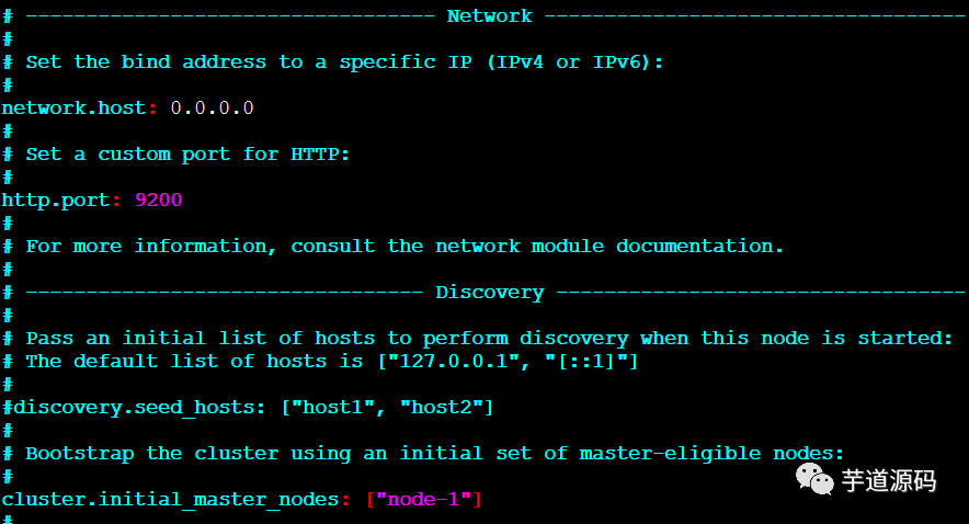修改es配置文件 elasticsearch.yml 取消注释,保留一个节点