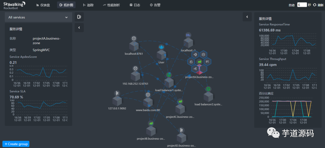 SkyWalking允许用户了解服务和端点之间的拓扑关系,查看每个服务/服务实例/端点的度量,并设置警报规则。