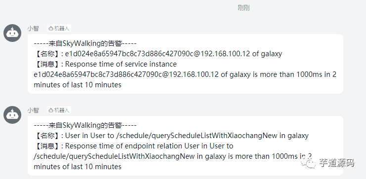 alarmMessageDTOList.forEach(e->dingTalkAlarmService.sendMessage(MessageFormat.format("-----来自SkyWalking的告警-----\n【名称】: {0}\n【消息】: {1}\n", e.getName(), e.getAlarmMessage())));