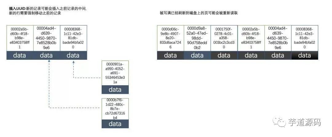 因为uuid相对顺序的自增id来说是毫无规律可言的,新行的值不一定要比之前的主键的值要大,所以innodb无法做到总是把新行插入到索引的最后,而是需要为新行寻找新的合适的位置从而来分配新的空间。