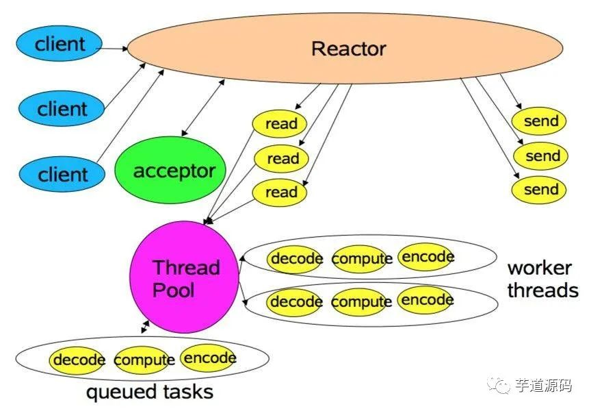 而Reactor模式则没有Queue来做缓冲,每当一个事件输入到Service Handler之后,该Service Handler会主动根据不同的Evnent类型将其分发给对应的Request Handler来处理。