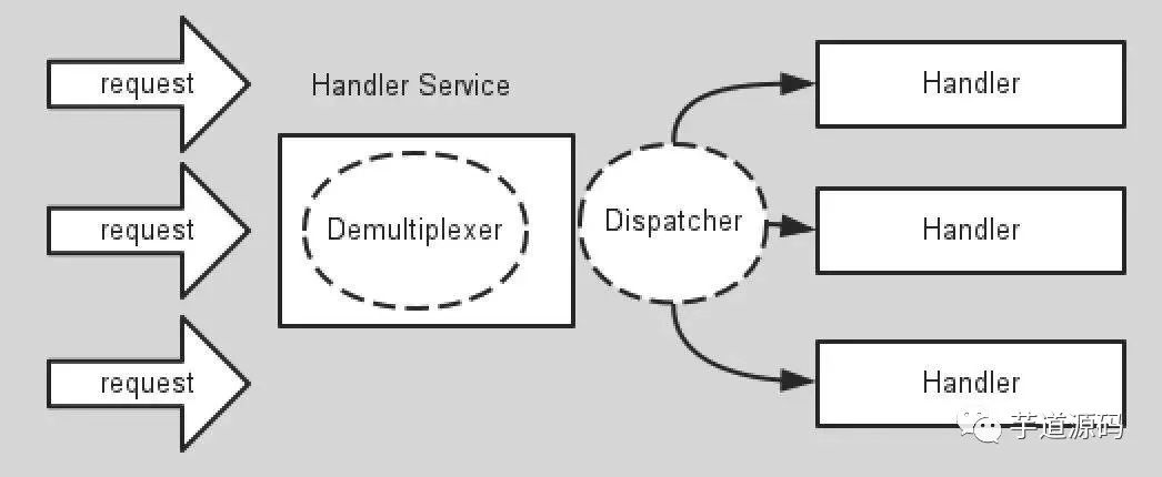 这个Service Handler会同步的将输入的请求多路复用的分发给相应的Request Handler。