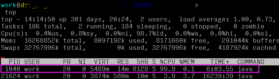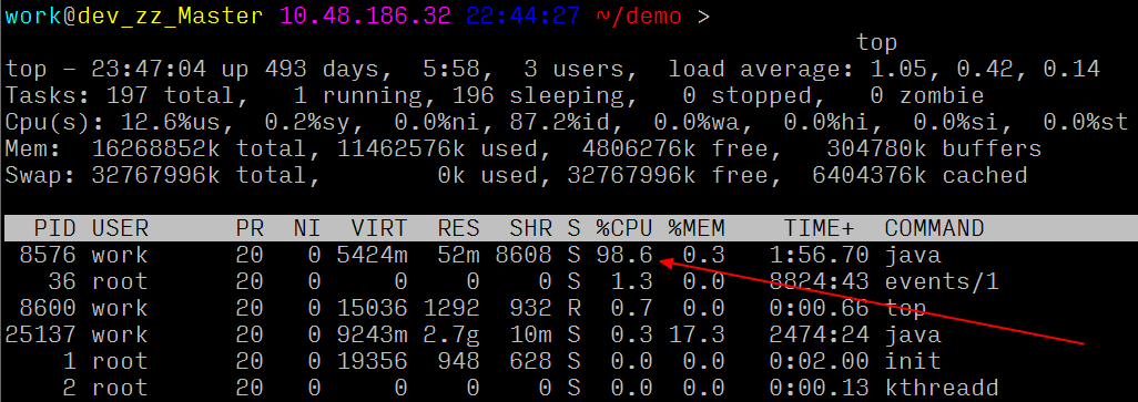 编译、运行上述代码之后,咱们就能观察到服务器多了一个 100% CPU 的 java 进程: