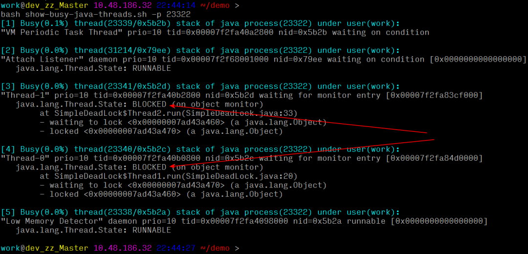 一键定位:可以清晰的看到线程互相锁住了对方等待的资源,导致死锁,直接定位到代码行和具体原因。
