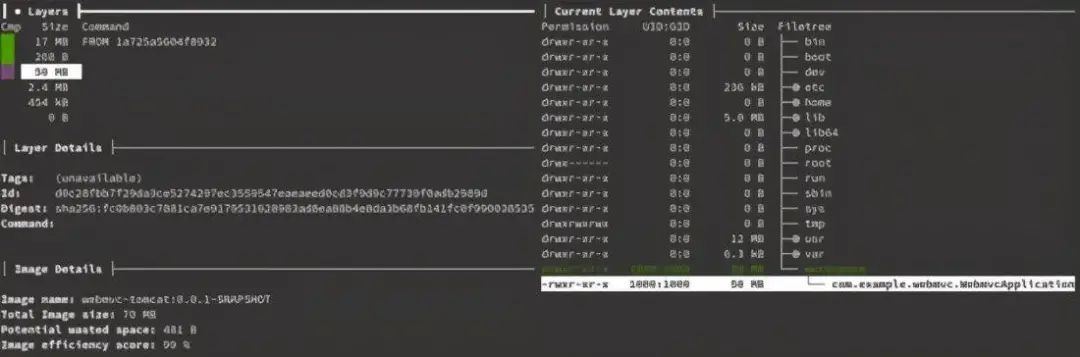 使用简单mvn spring-boot:build-image或gradle bootBuildImage命令,您可以生成一个优化的容器映像,该映像将包含一个最小的OS层和一个小的本机可执行文件,该映像仅随附JDK,Spring以及您在应用程序中使用的依赖项中的必需位。请参阅下面的示例,其中包含50MB可执行文件的最小容器映像,其中包含Spring Boot,Spring MVC,Jackson,Tomcat,JDK和应用程序。