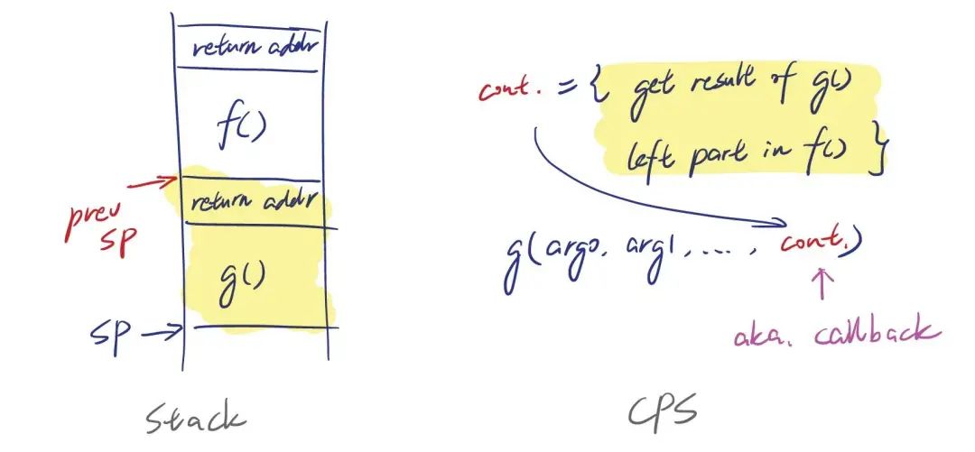 魔法的背后是 CPS 变换,CPS 变换把普通函数转换成一个 CPS 的函数,即 Continuation 也能作为一个调用参数 。函数不仅能从头运行,还能根据 Continuation 的指示继续某个点(比如调用 IO 的地方)运行。
