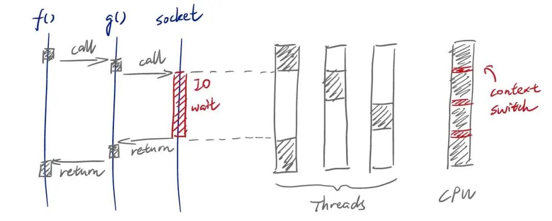 光有回调函数其实并没有卵用。对于纯粹的计算工作,Call Stack 就很好,为何要费时费力用回调来做 Continuation 呢?你说的对,但仅限于没有 IO 的情况。我们知道 IO 通常要比 CPU 慢上好几个数量级,在 BIO 中,线程发起 IO 之后只能暂停,然后等待 IO 完成再由操作系统唤醒。
