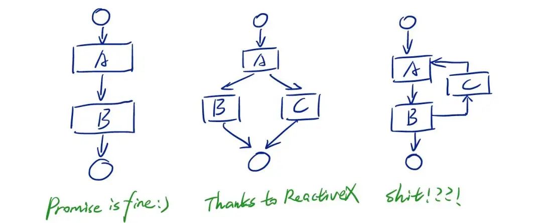Reactive 可以看作是对 Promise 的极大增强,相比 Promise,反应式引入了流(Flow)的概念 。ReactiveX 中的事件流从一个 Observable 对象流出,这个对象可以是一个按钮,也可以是 Restful API,总之,它能被外界触发。与 Promise 不同的是,事件可能被触发多次,所以处理代码也会被多次调用。