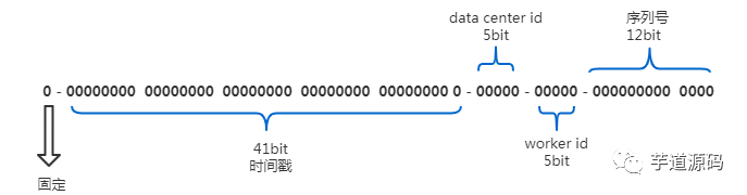 Snowflake是Twitter 的开源项目,它生成的ID是64bit的正整数,结构如图: