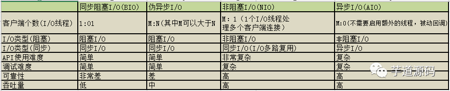 前面对不同的I/O模型进行了简单介绍,不同的I/O 模型由于线程模型、API 等差别很大,所以用法的差异也非常大。我们用一个表格来做一个统一说明: