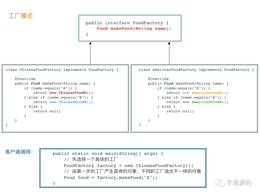 虽然都是调用 makeFood("A") 制作 A 类食物,但是,不同的工厂生产出来的完全不一样。