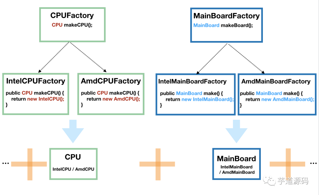 因为电脑是由许多的构件组成的,我们将 CPU 和主板进行抽象,然后 CPU 由 CPUFactory 生产,主板由 MainBoardFactory 生产,然后,我们再将 CPU 和主板搭配起来组合在一起,如下图:
